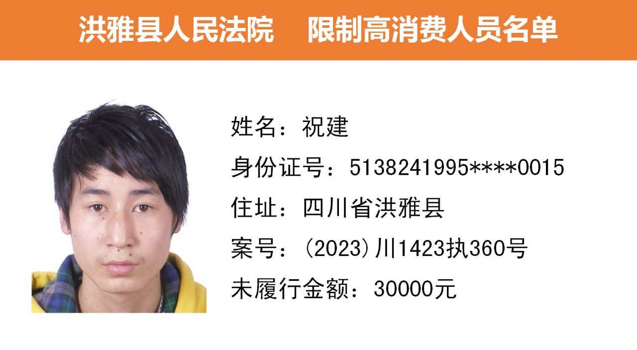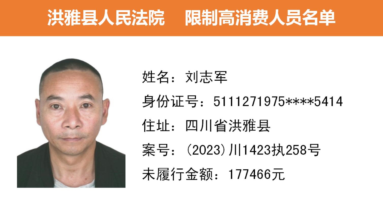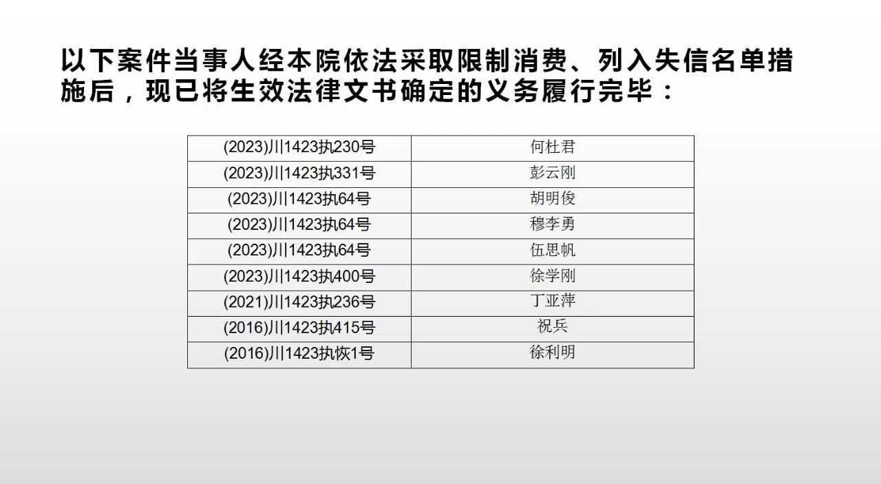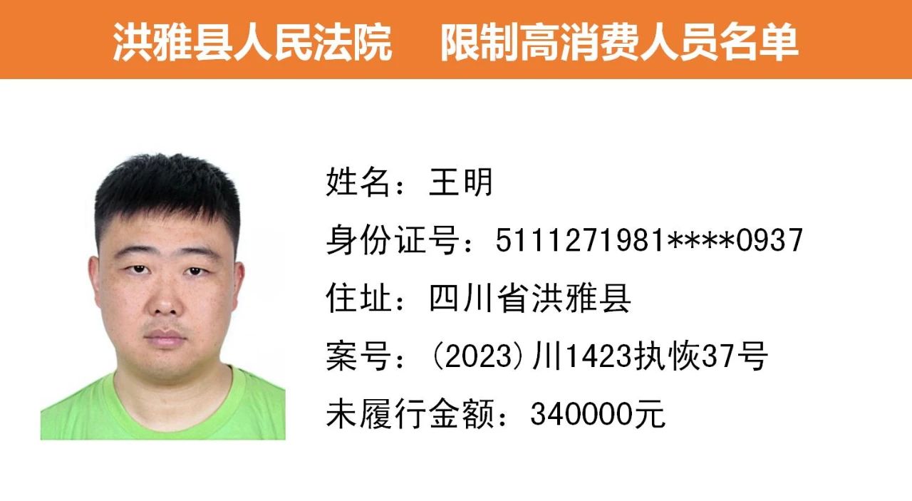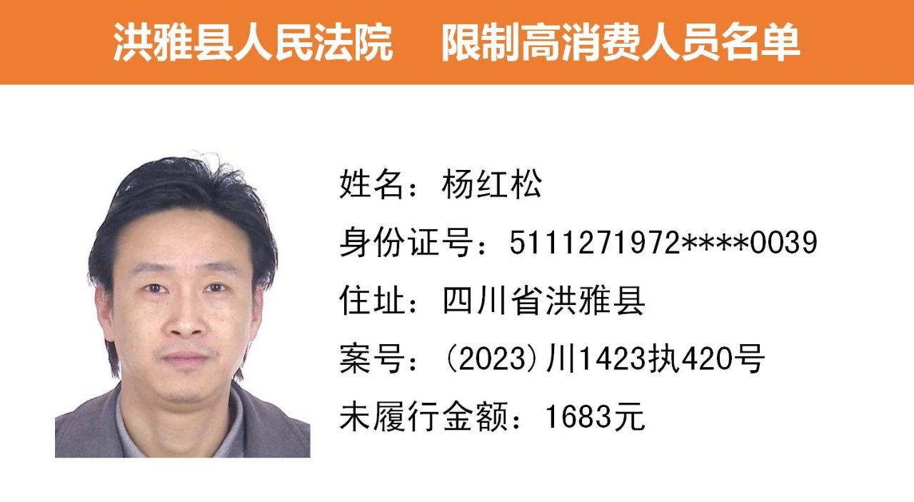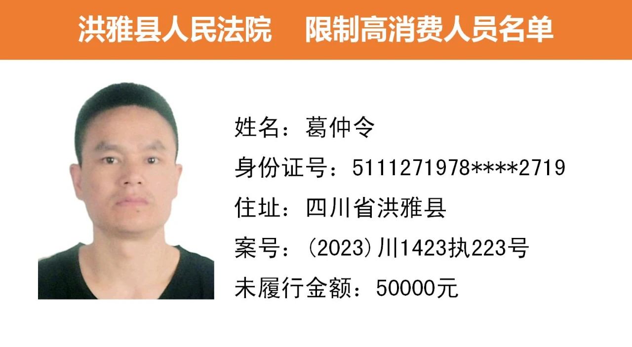 2023年第九期,经依法审查,现将下列失信被执行人、限制高消费人员、已履行义务人员名单予以公布,希望社会各界予以监督,如有发现失信被执行人财产线索的,请向洪雅县人民法院举报。举报电话:028-37403639。