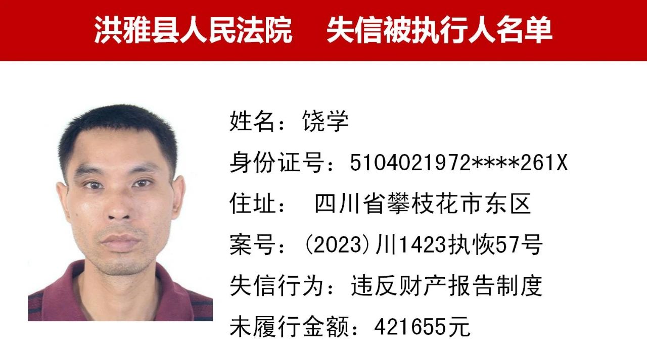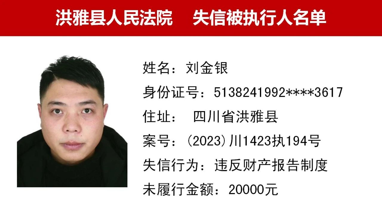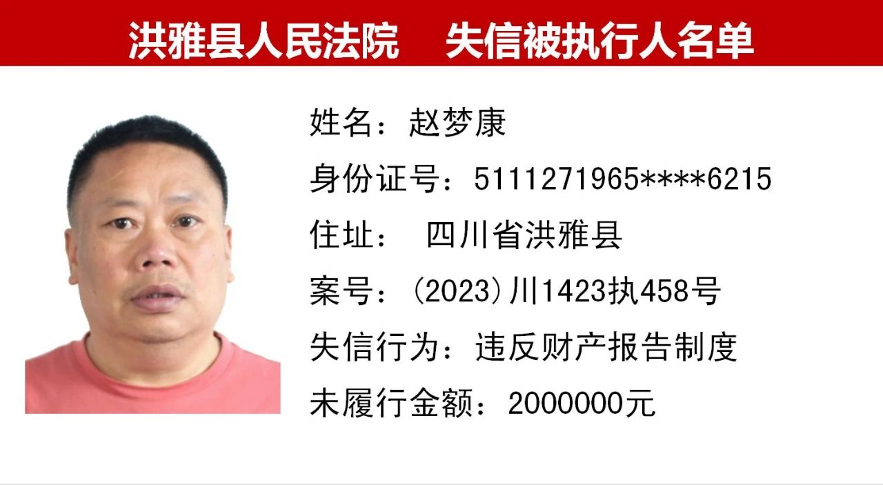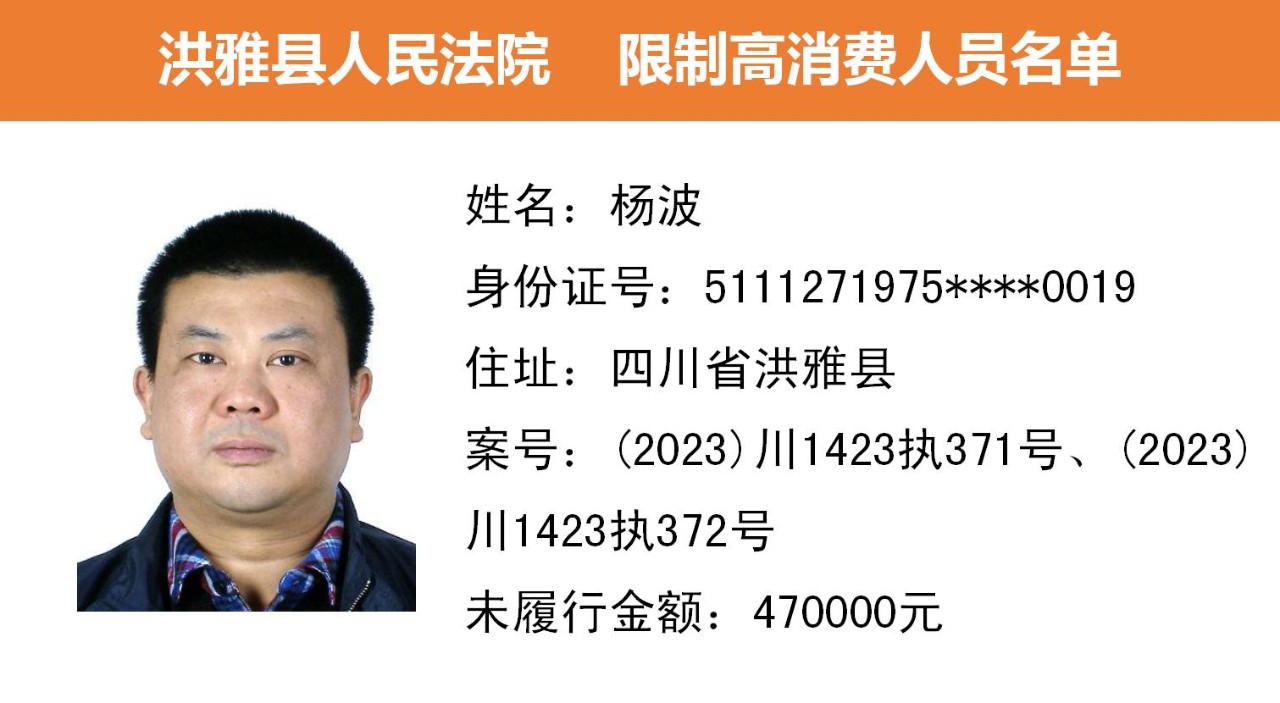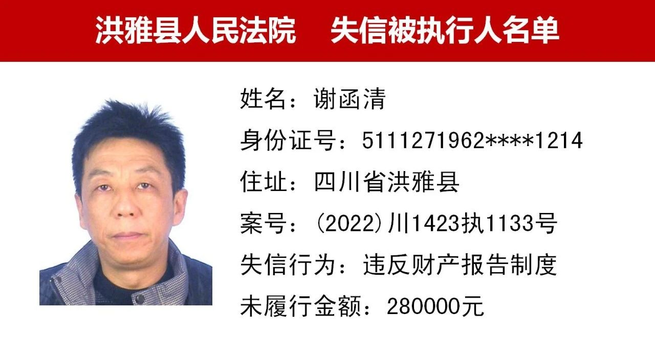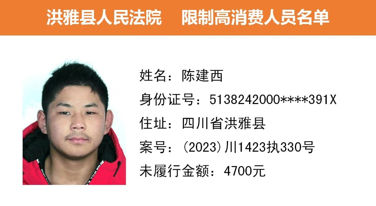 2023年第九期,经依法审查,现将下列失信被执行人、限制高消费人员、已履行义务人员名单予以公布,希望社会各界予以监督,如有发现失信被执行人财产线索的,请向洪雅县人民法院举报。举报电话:028-37403639。