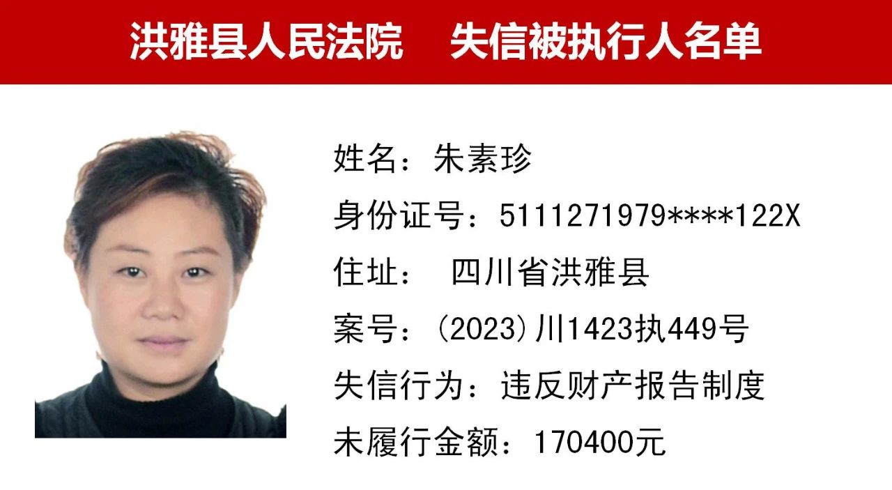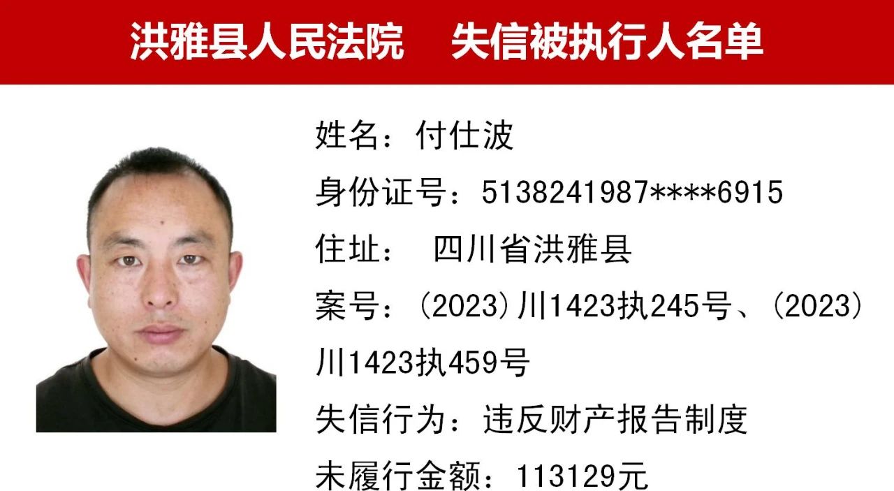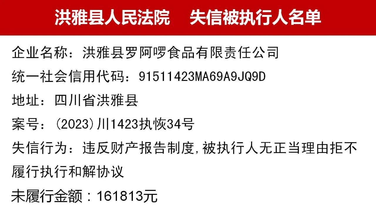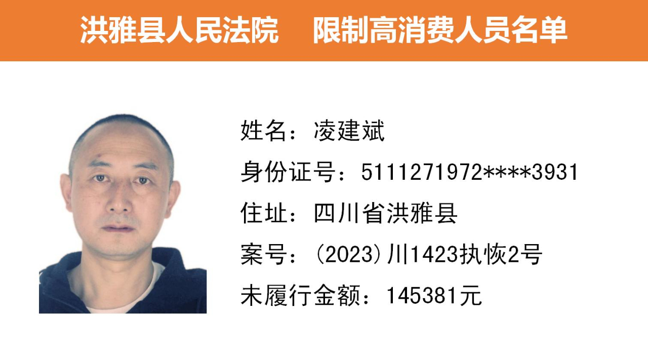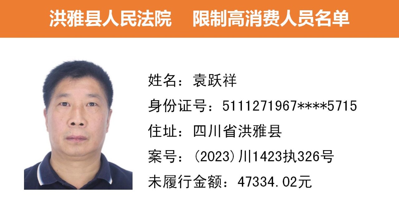 2023年第九期,经依法审查,现将下列失信被执行人、限制高消费人员、已履行义务人员名单予以公布,希望社会各界予以监督,如有发现失信被执行人财产线索的,请向洪雅县人民法院举报。举报电话:028-37403639。