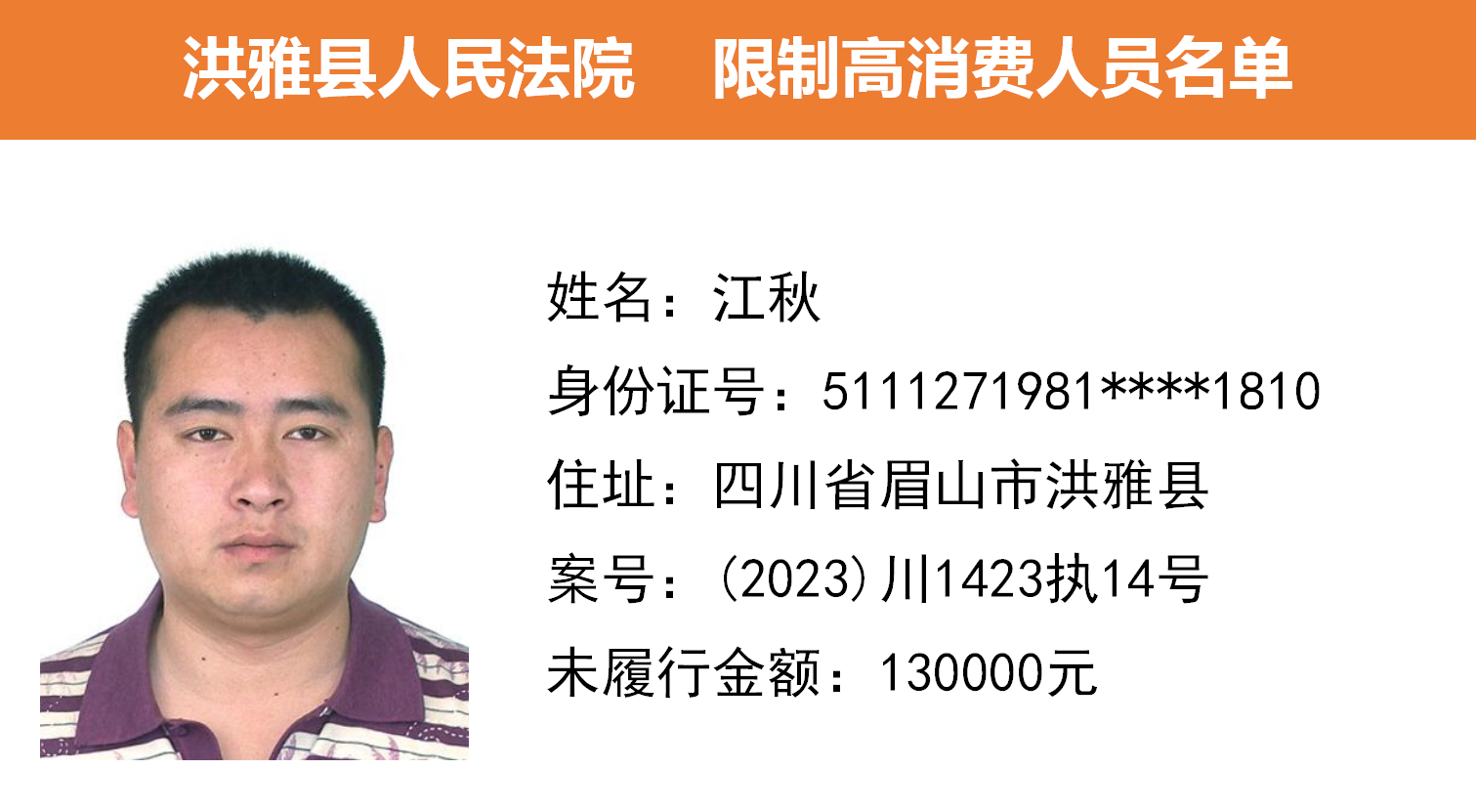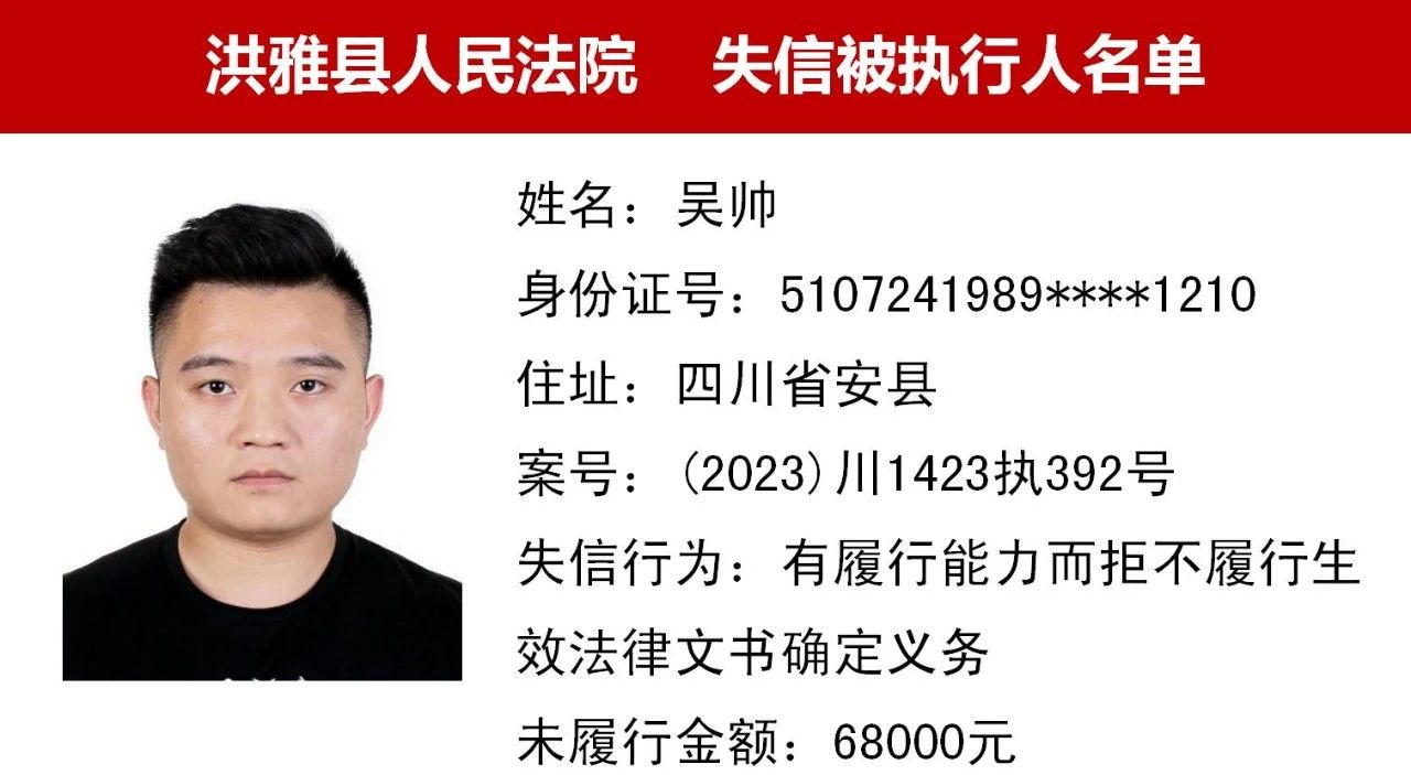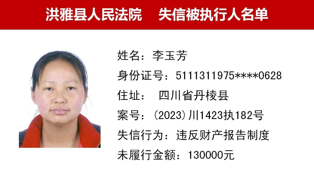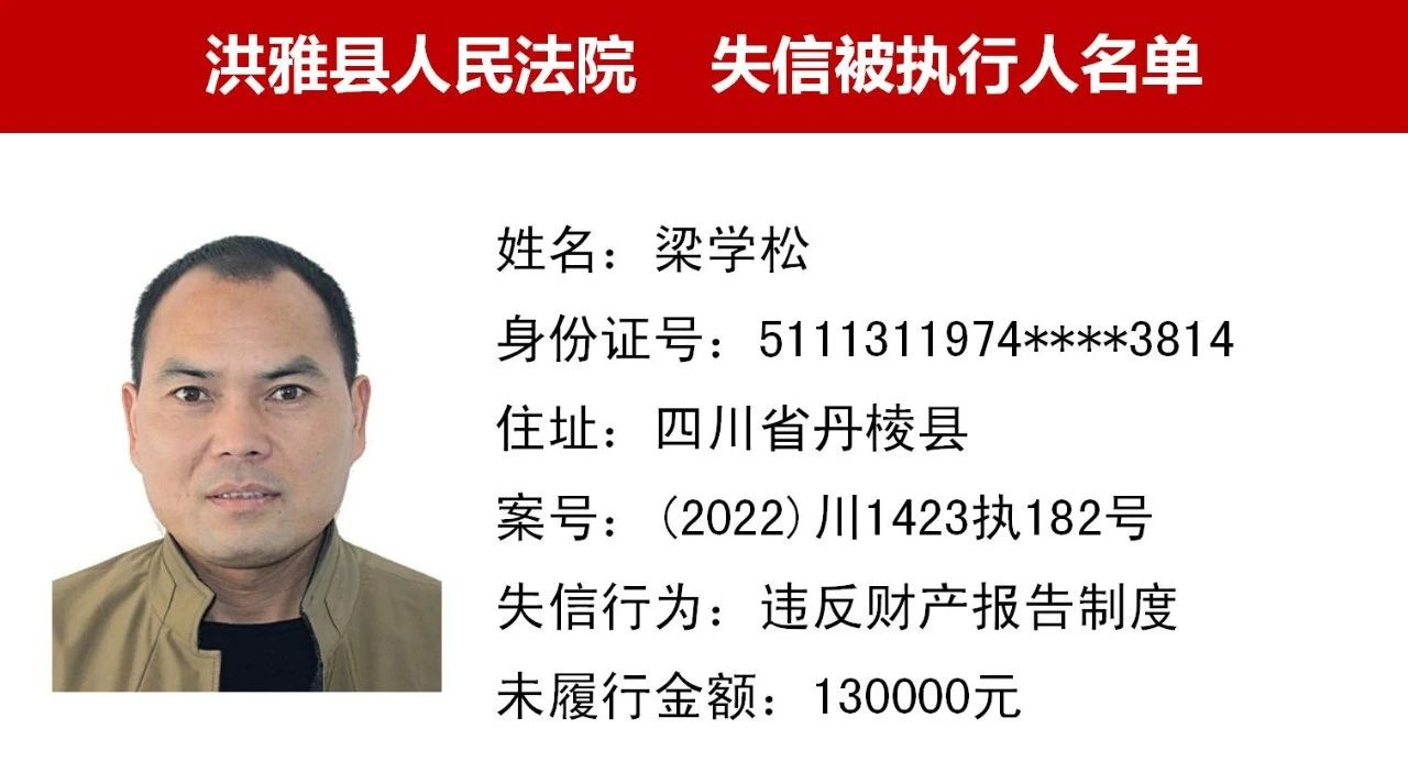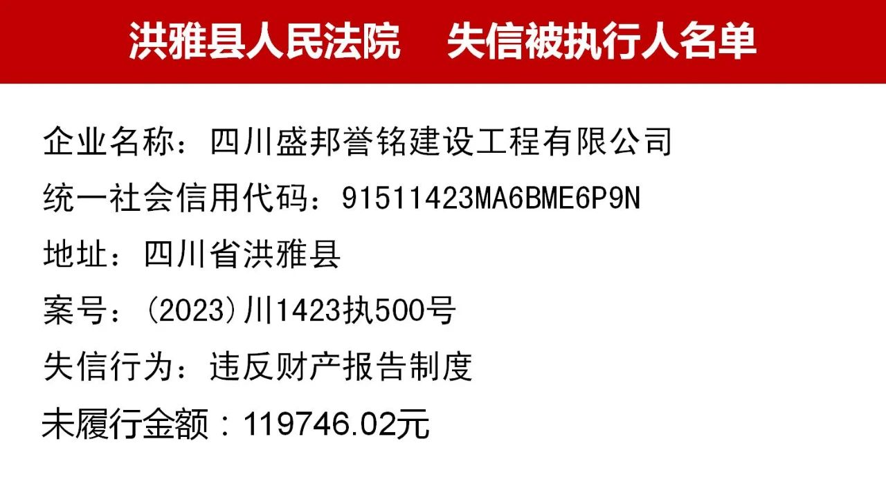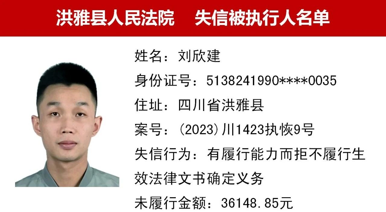 2023年第九期,经依法审查,现将下列失信被执行人、限制高消费人员、已履行义务人员名单予以公布,希望社会各界予以监督,如有发现失信被执行人财产线索的,请向洪雅县人民法院举报。举报电话:028-37403639。