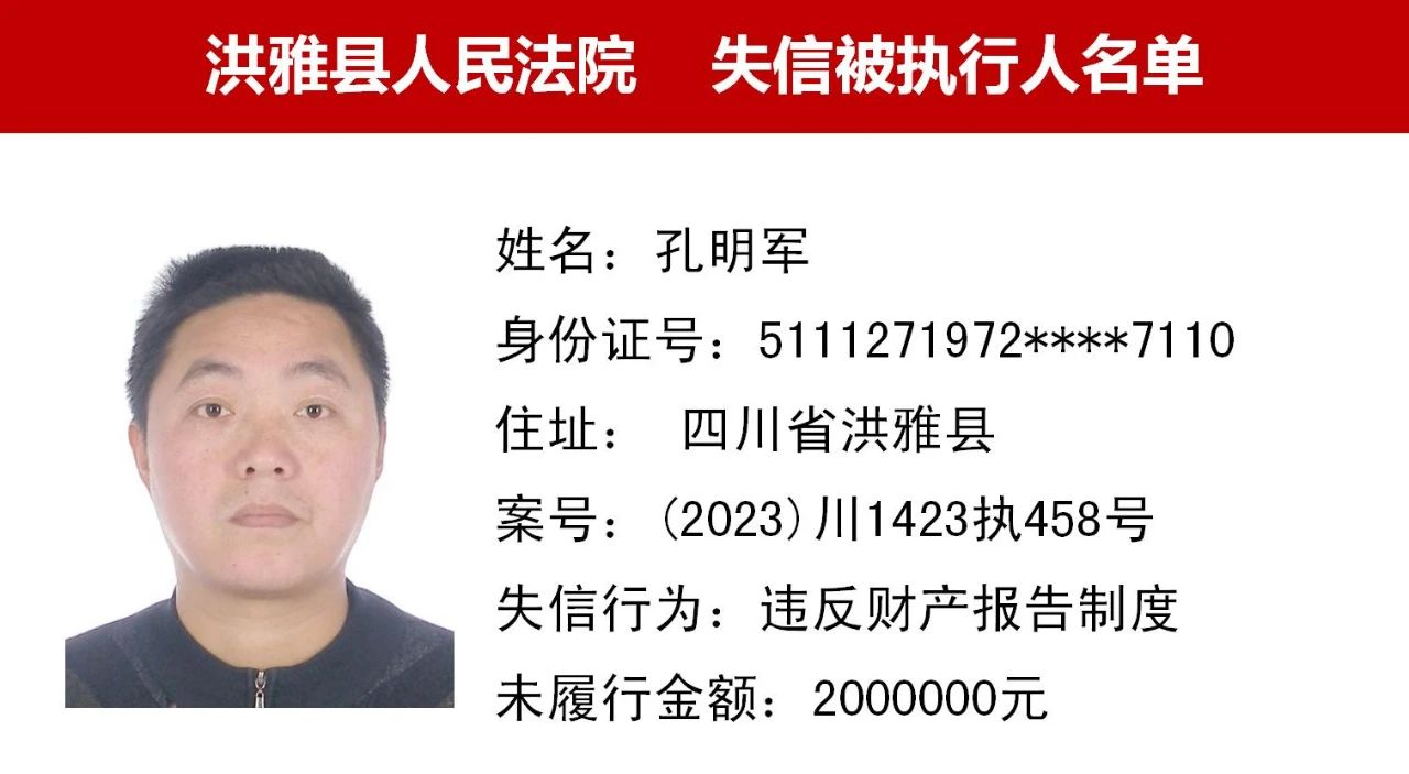 为切实保护申请执行人的合法权益,促使被执行人自觉履行生效法律文书确定的义务,推进社会信用体系建设,维护司法权威,根据 《最高人民法院关于公布失信被执行人名单信息的若干规定》的相关规定,本公众号推出【曝光台】,定期向社会公布眉山法院失信被执行人名单。