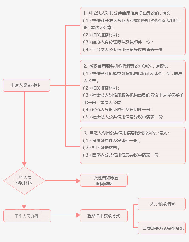 信用主体线下异议申请需要根据要求准备相应材料,申请人提交材料后,工作人员查验材料,材料不符合要求需退回修改,材料符合要求后,工作人员对异议进行受理处理,20个工作日内会反馈结果。可选择至大厅获取结果或者选择自费邮寄。